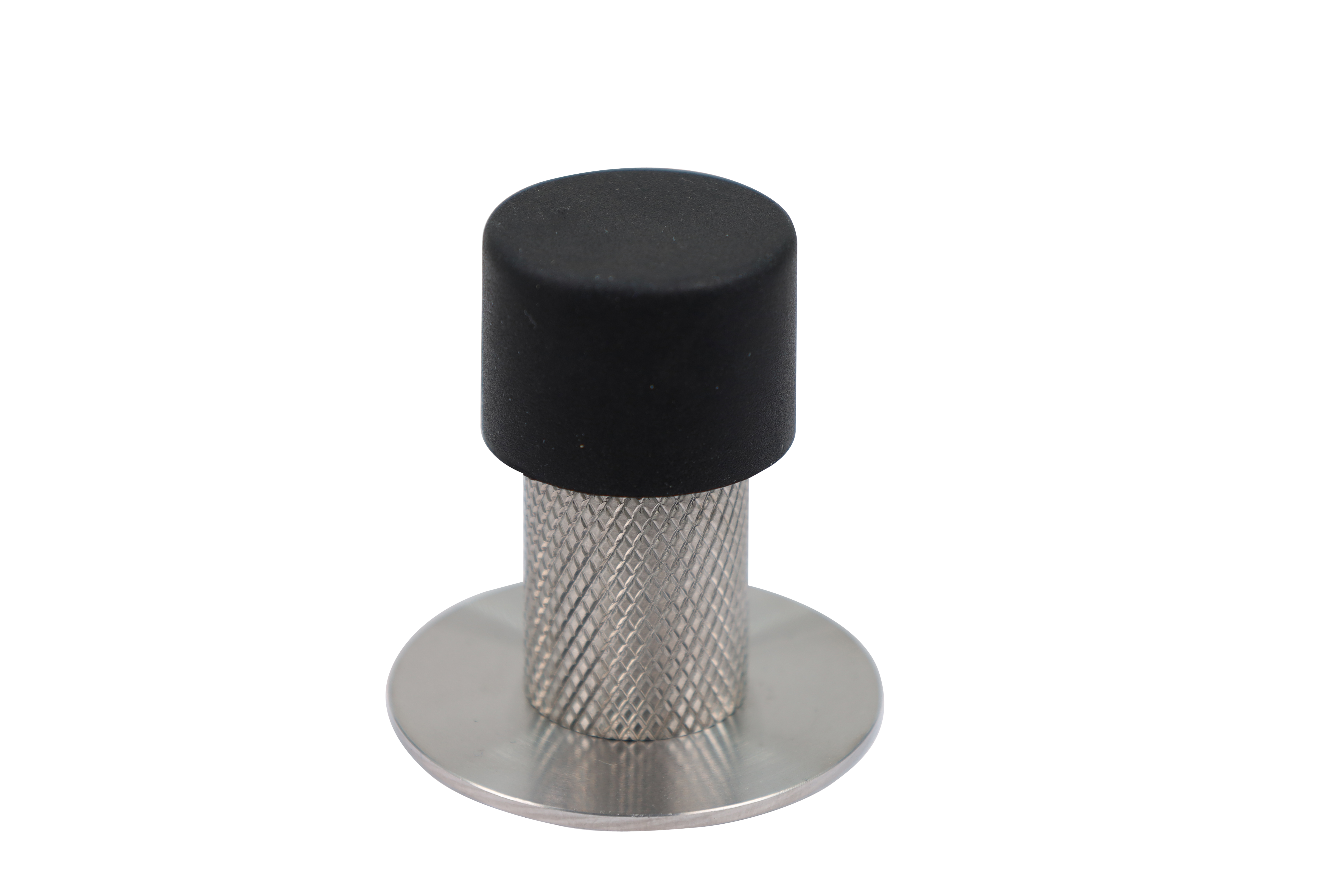 Dørstopper med stor gummibuffer og diamantmønstret overflade. Til væg/gulv. Inkl. skrue til montering.