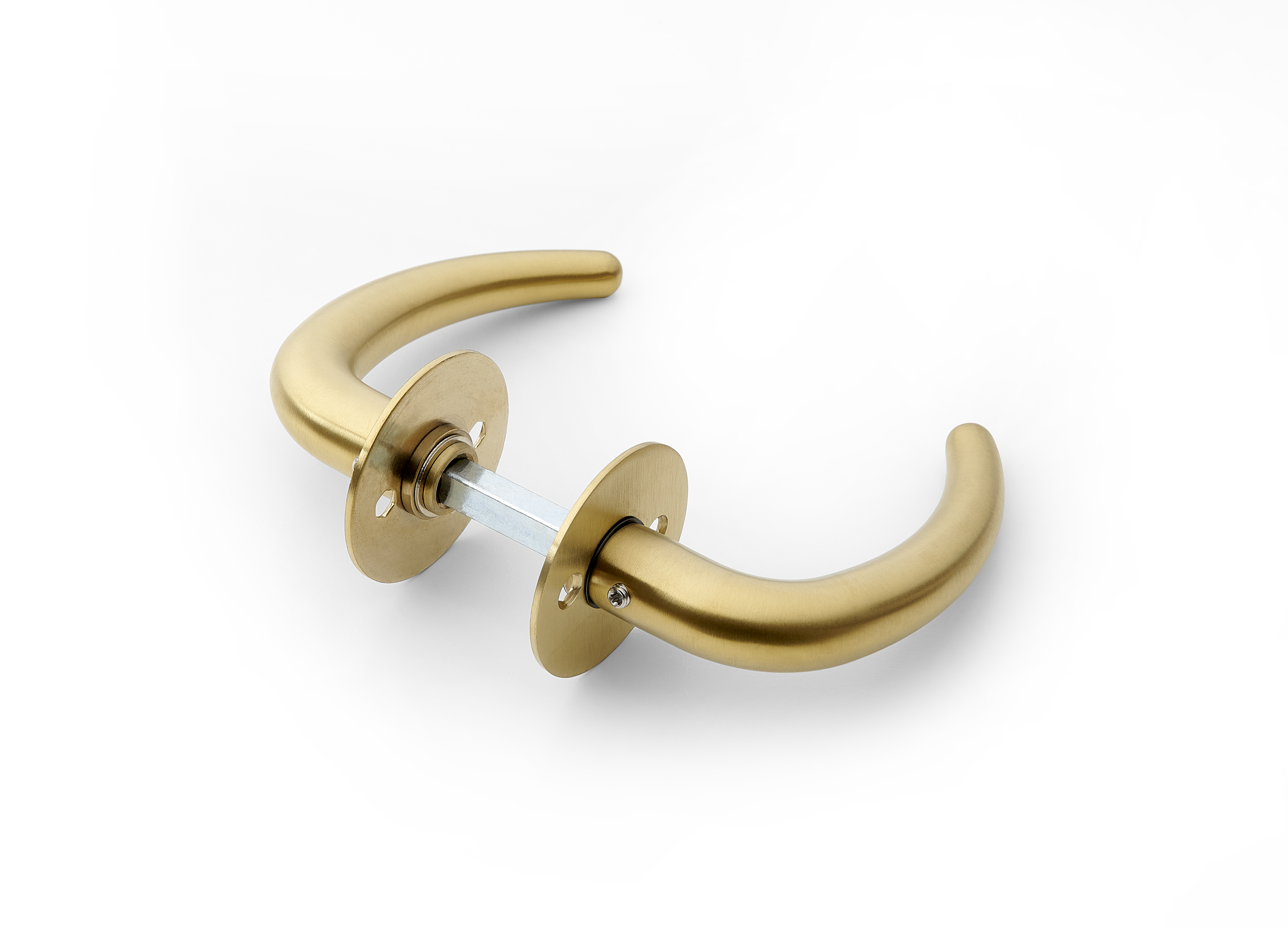 Klassisk Coupé dørgreb med fastmonteret 2 mm massiv roset (Ø52 mm). Inkl. 8x8 mm dørgrebspind samt skruer og bøsninger til montering.