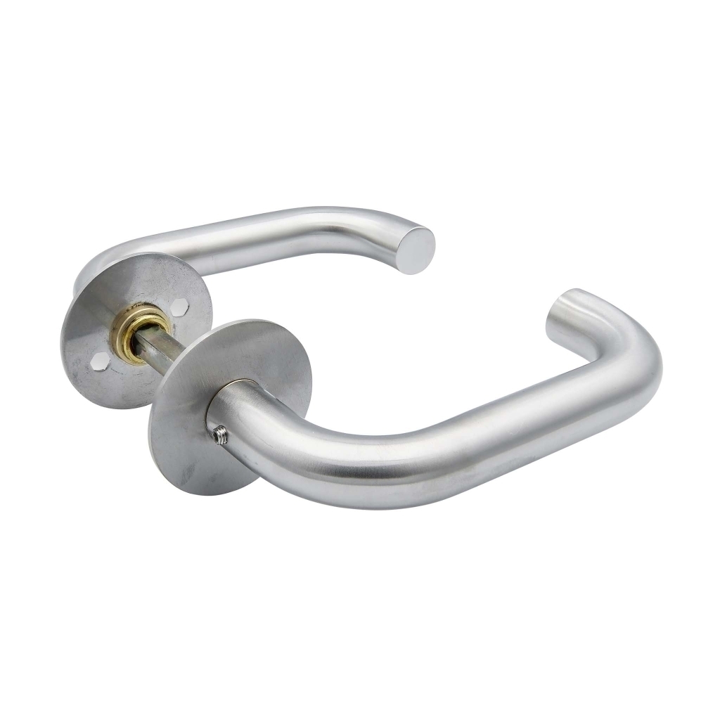 U-formet dørgreb med fuldsvejset messinghals (Ø15,7x6,5 mm) og 8x8x110 mm dørgrebspind. Med massiv roset (Ø50x2 mm) med messingring samt påsvejsede M4x12 mm bøsninger. Inkl. 2 stk. M4x110 mm knækskruer i rustfrit stål, 2 stk. M4x38 mm maskinskruer i rustfrit stål, 2 stk. M6x7 mm pinolskruer i rustfrit stål samt 1 stk. CC30 styrebrik i nylon.
