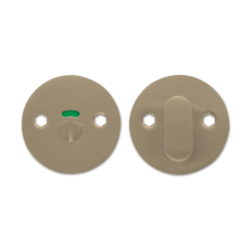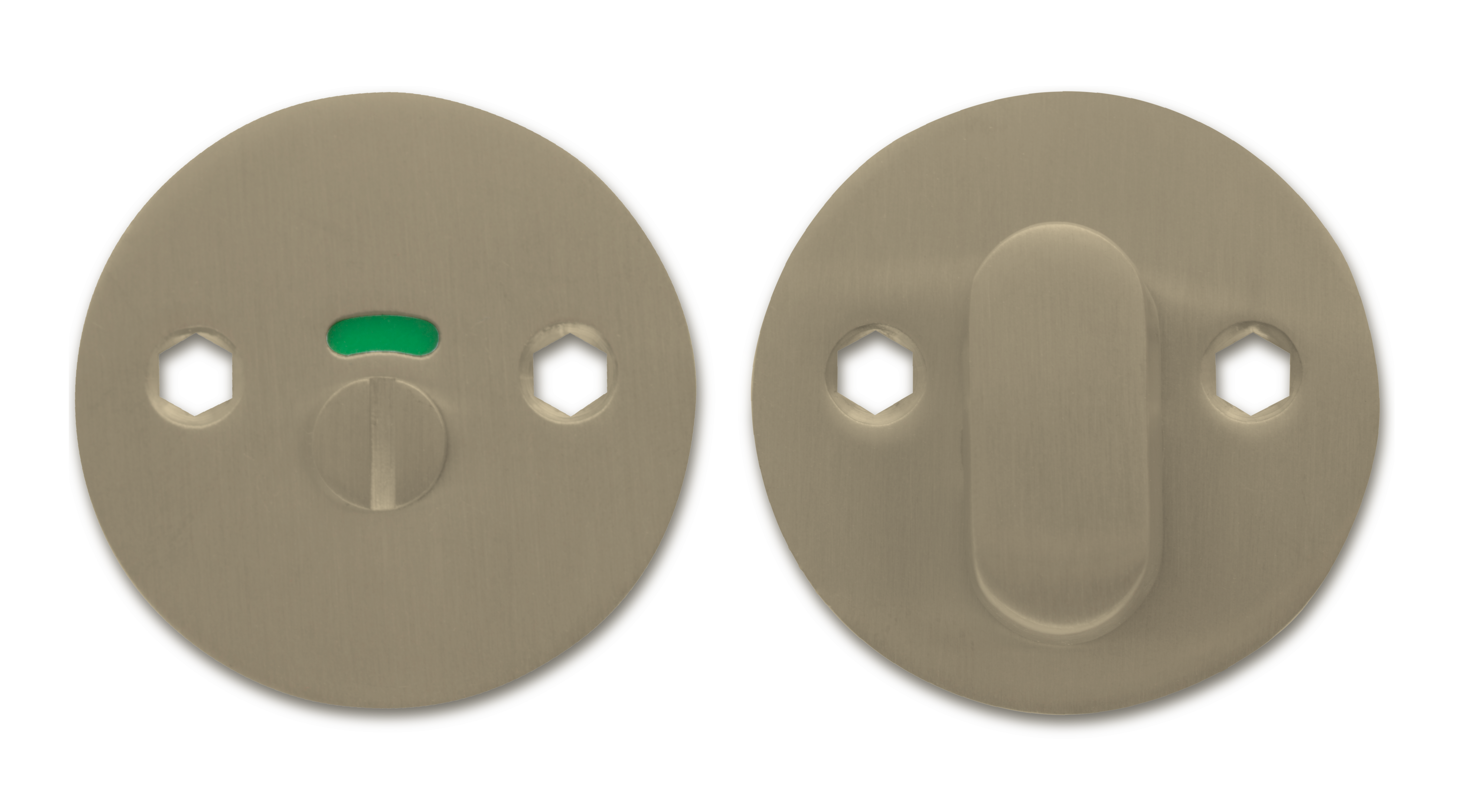 2 mm massiv toiletbesætning (Ø50 mm) til modul/mellemdør. Med designvrider og rød/grøn-markering. Inkl. skruer og bøsninger til montering.