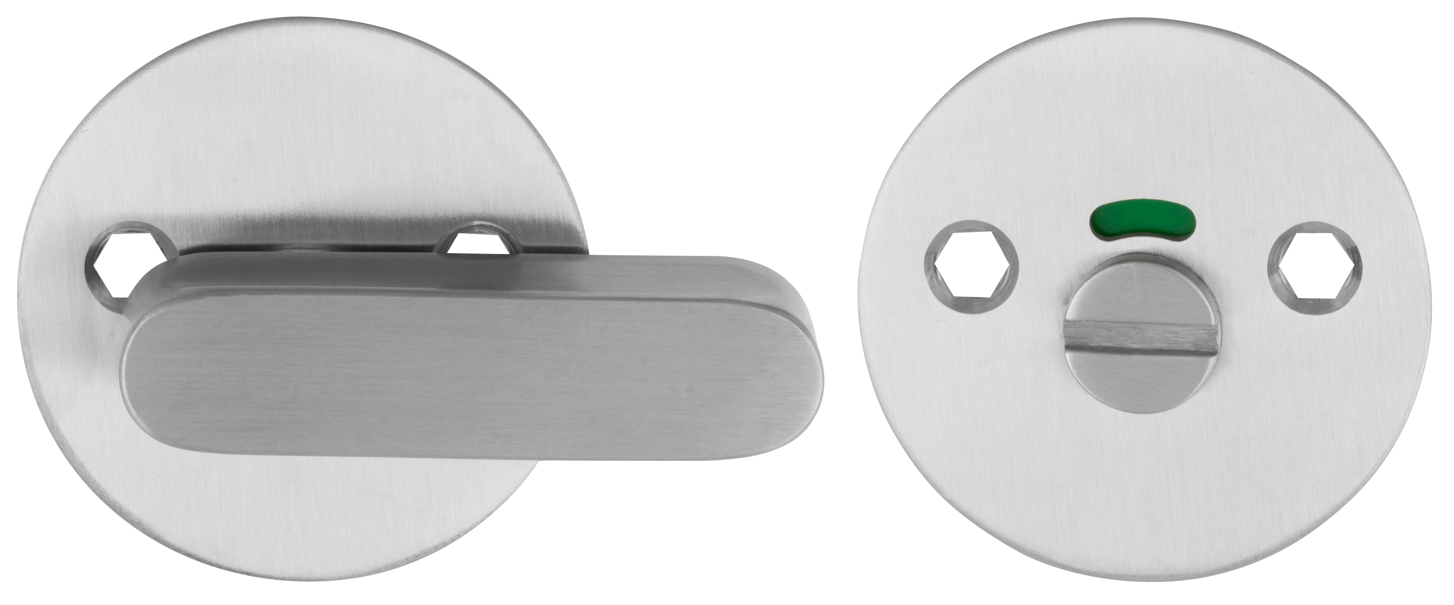 2 mm massiv toiletbesætning (Ø50 mm) til mellemdørslås. Med handikapvrider og rød/grøn markering. Inkl. skruer og bøsninger til montering.