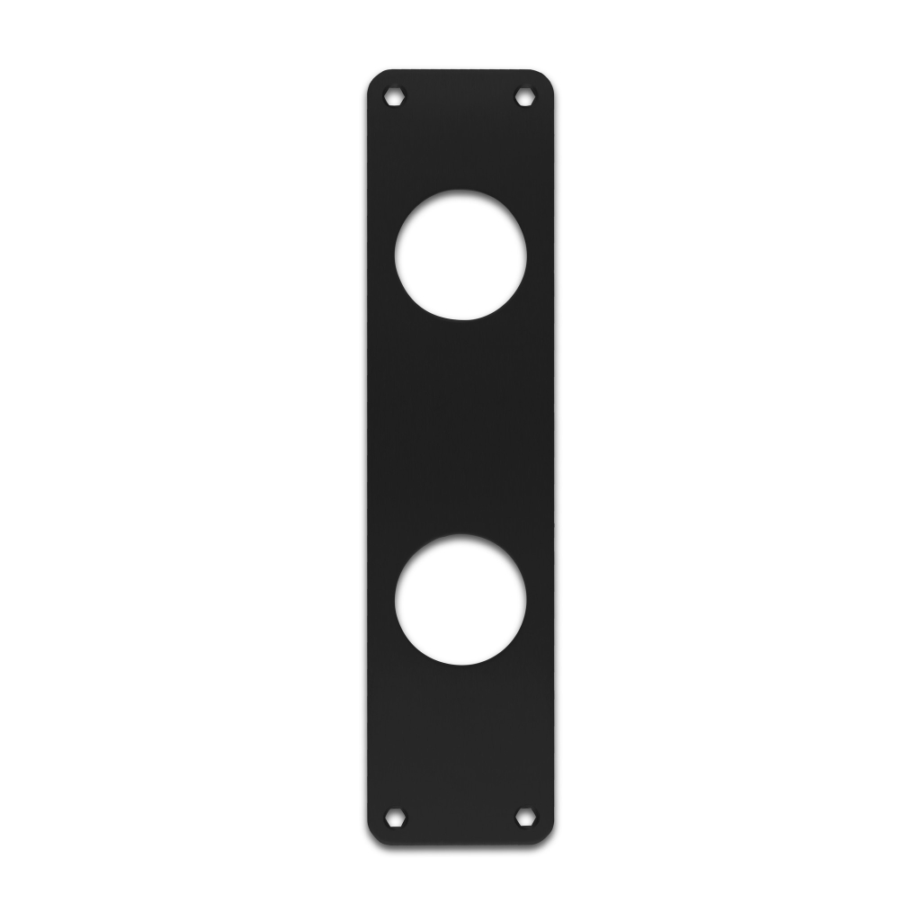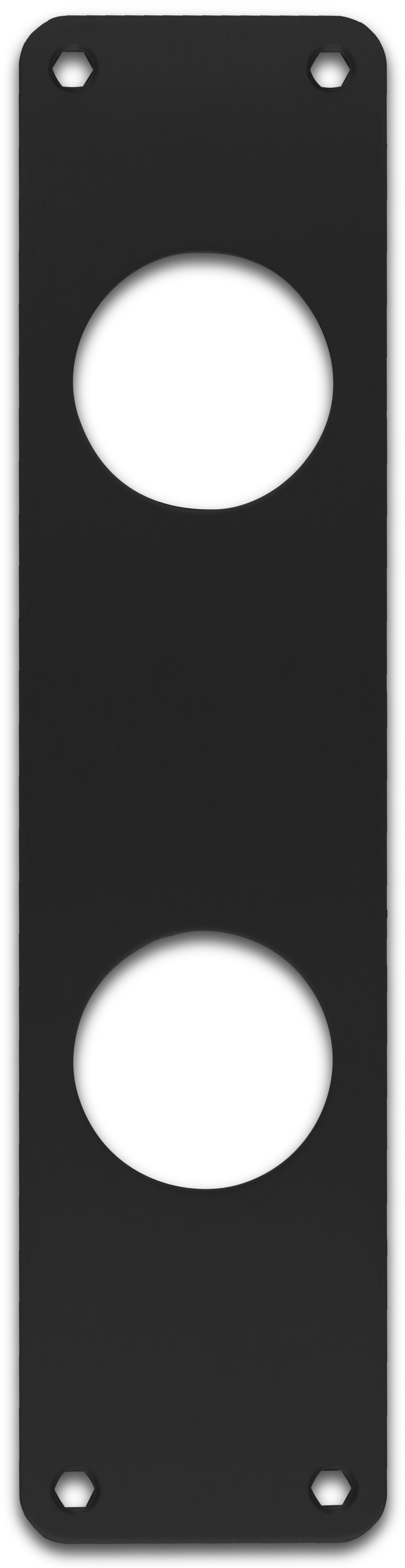 Stort massivt langskilt med to runde huller (Ø40 mm). Måler 250x60x2 mm. Inkl. skruer til montering.