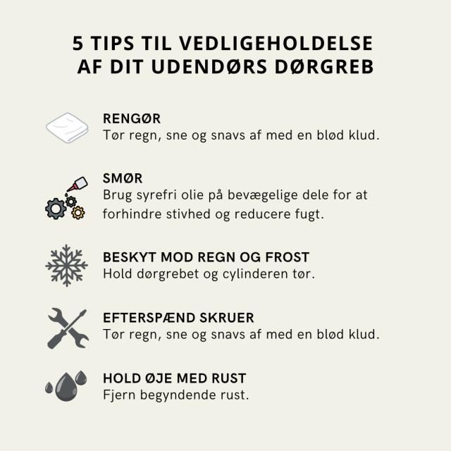 Det kan virke unødvendigt at skulle vedligeholde et udendørs dørgreb, som man tænker burde kunne holde til det ”udendørs liv”. Men det er god investering. For lidt pleje i de kolde måneder kan spare dig for frosne døre, rustpletter og unødigt bøvl. Og så holder dit dørgreb sig pænt og nemt at bruge.