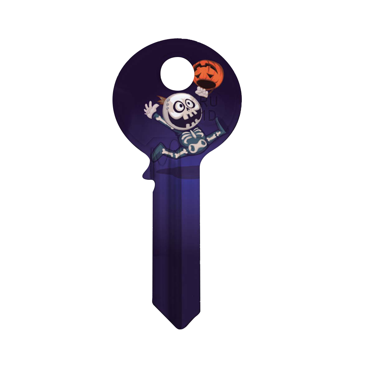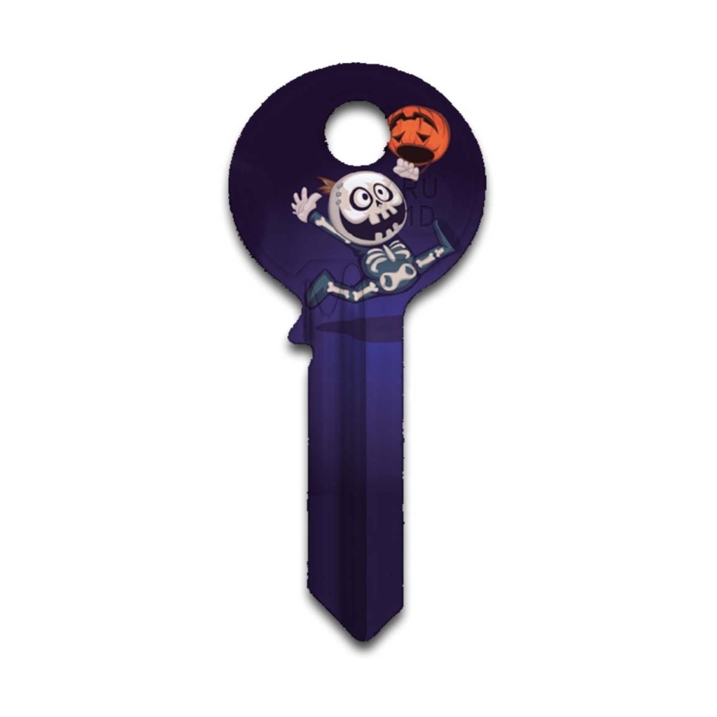 5-stift nøgle med rundt hoved og Skelet-motiv. Nøgler med motiv kan hjælpe med at kende forskel på de mange nøgler, der ofte befinder sig i et nøglebundt.