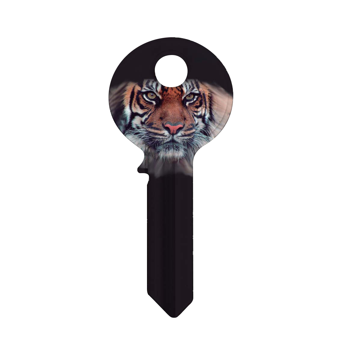 5-stift nøgle med rundt hoved og Tiger-motiv. Nøgler med motiv kan hjælpe med at kende forskel på de mange nøgler, der ofte befinder sig i et nøglebundt.