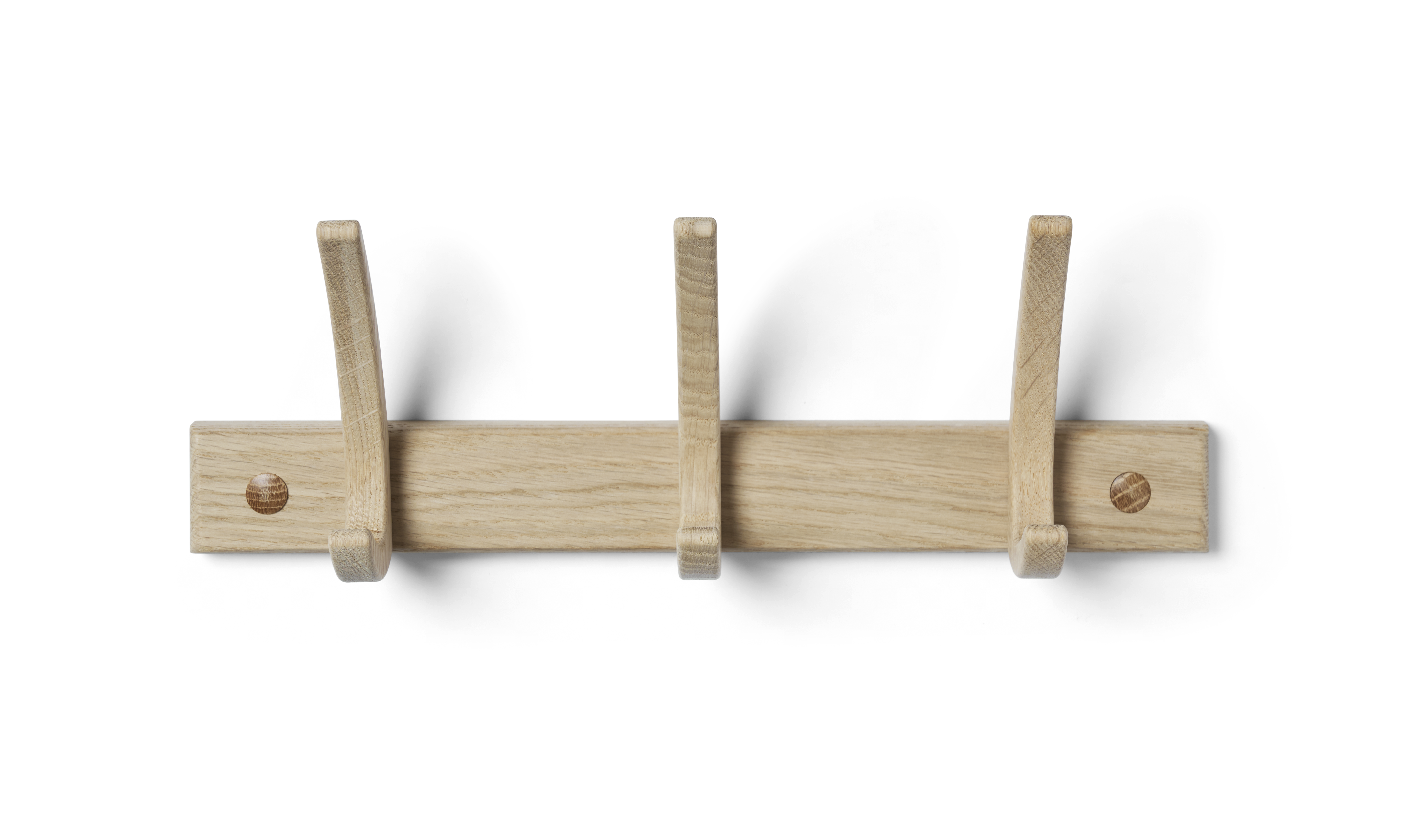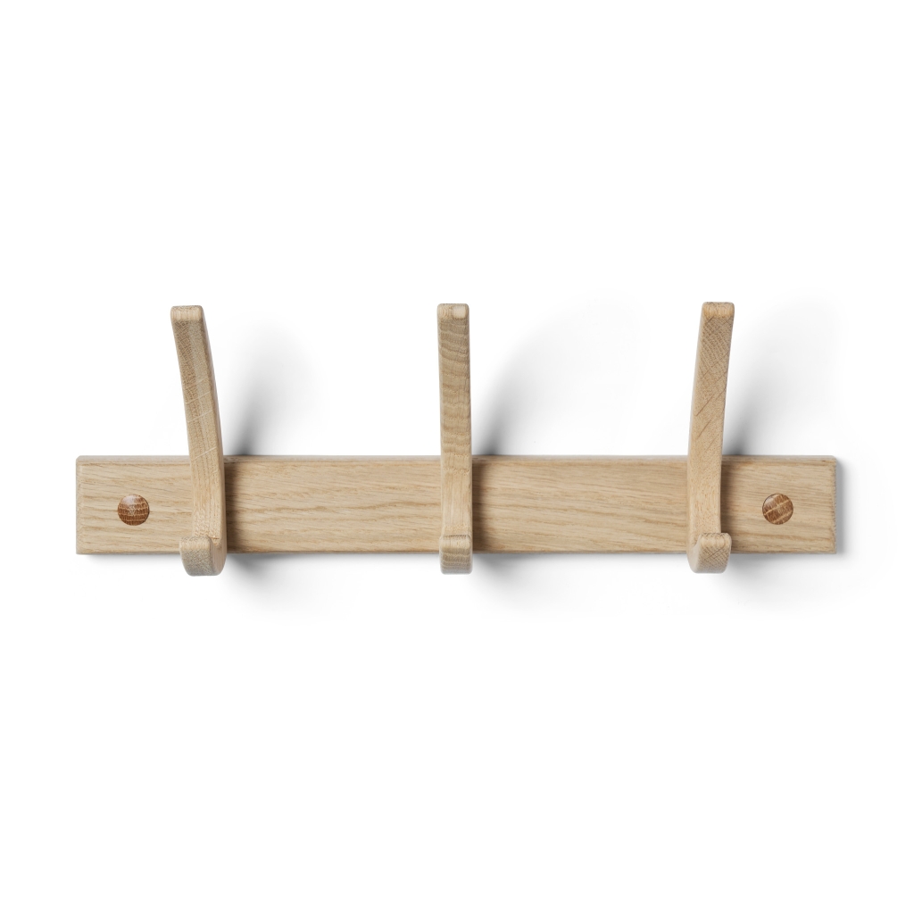 Enkel knagerække med tre kroge til montering på væg. Ideel til ophæng af jakker, tasker, håndklæder eller accessories i entreen, køkkenet eller på badeværelset. Selve panelet måler 300x37x12 mm, mens frakkekrogen måler 110x53x13 mm. Inkl. træknopper, der diskret dækker skruerne for et gennemført udtryk.