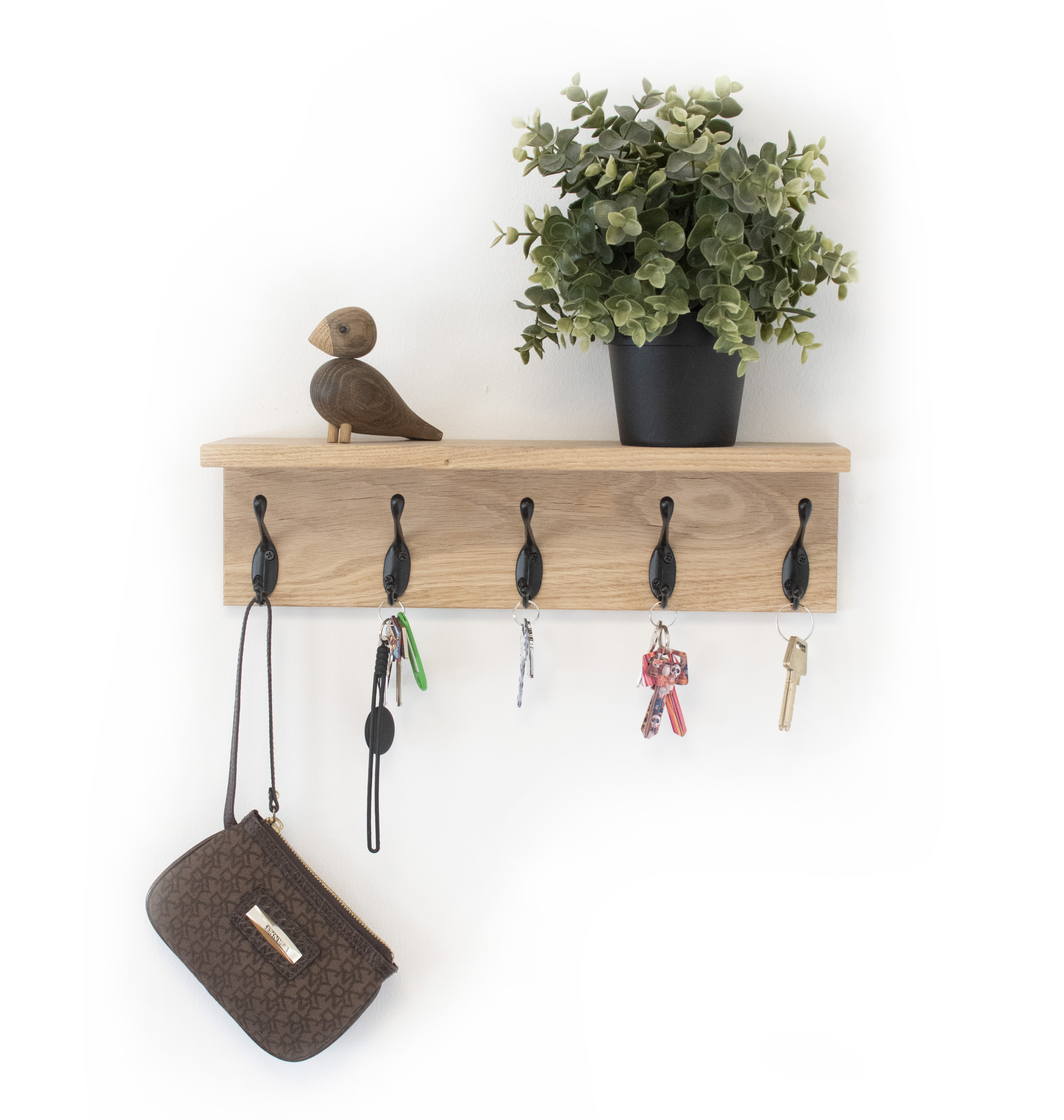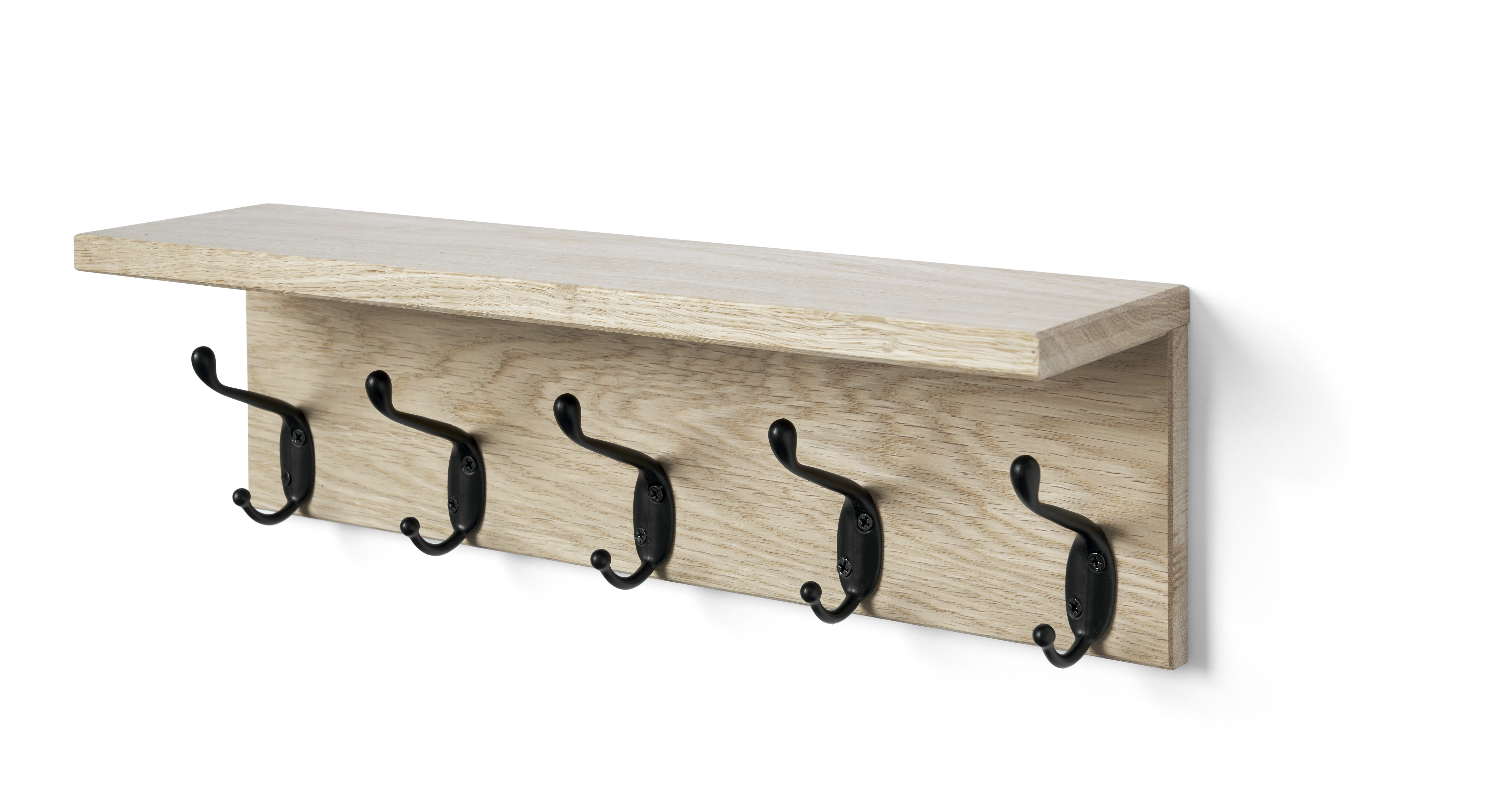 Funktionel knagerække med hylde samt fem sorte metalkroge. Til ophæng af lette jakker, tasker eller accessories i entreen.