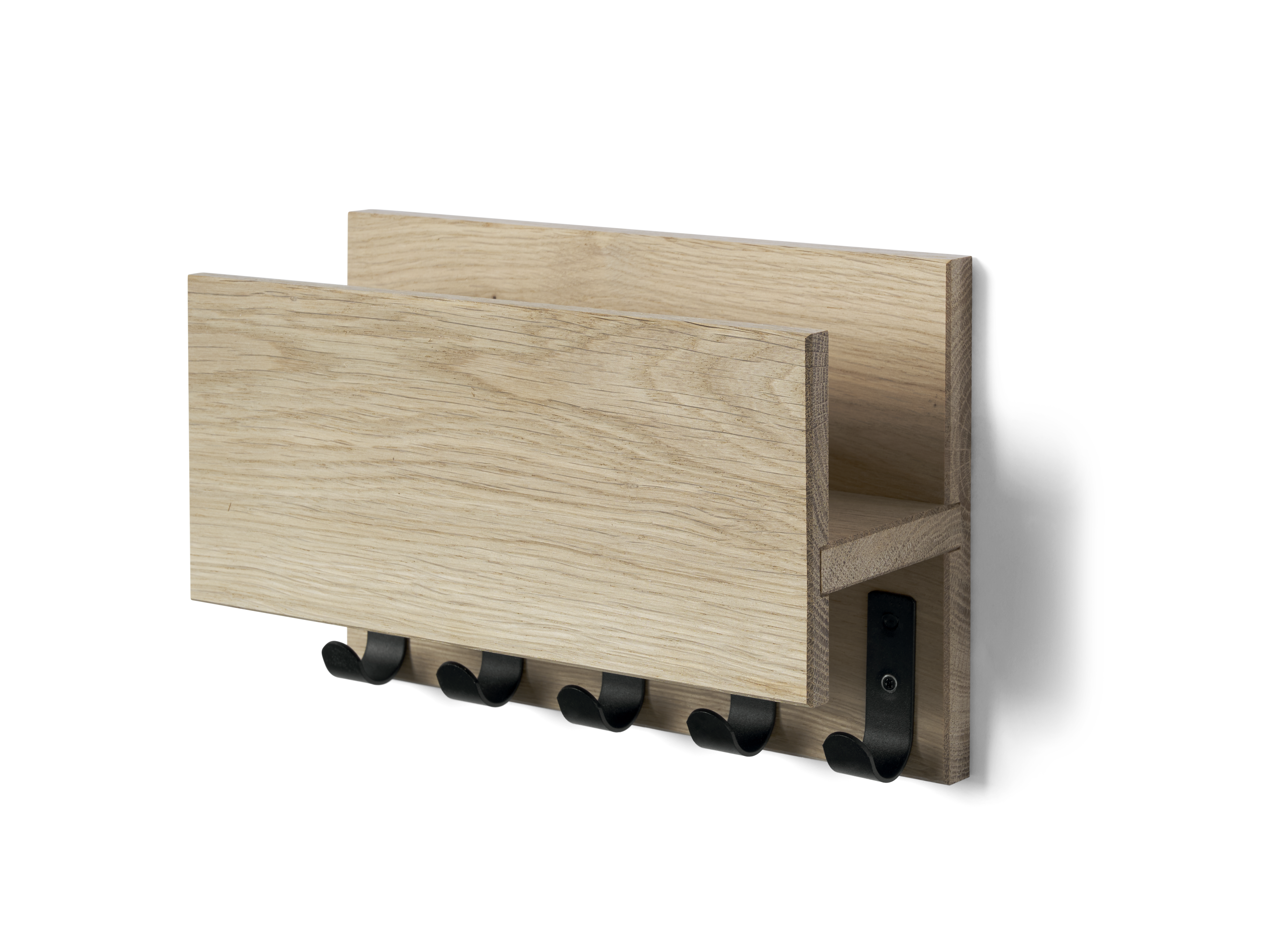 Praktisk nøgleholder med hylde og fem sorte kroge til opbevaring af pung, mobiltelefon, nøgler eller lignende.