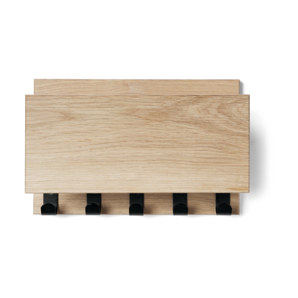 Praktisk nøgleholder med hylde og fem sorte kroge til opbevaring af pung, mobiltelefon, nøgler eller lignende.