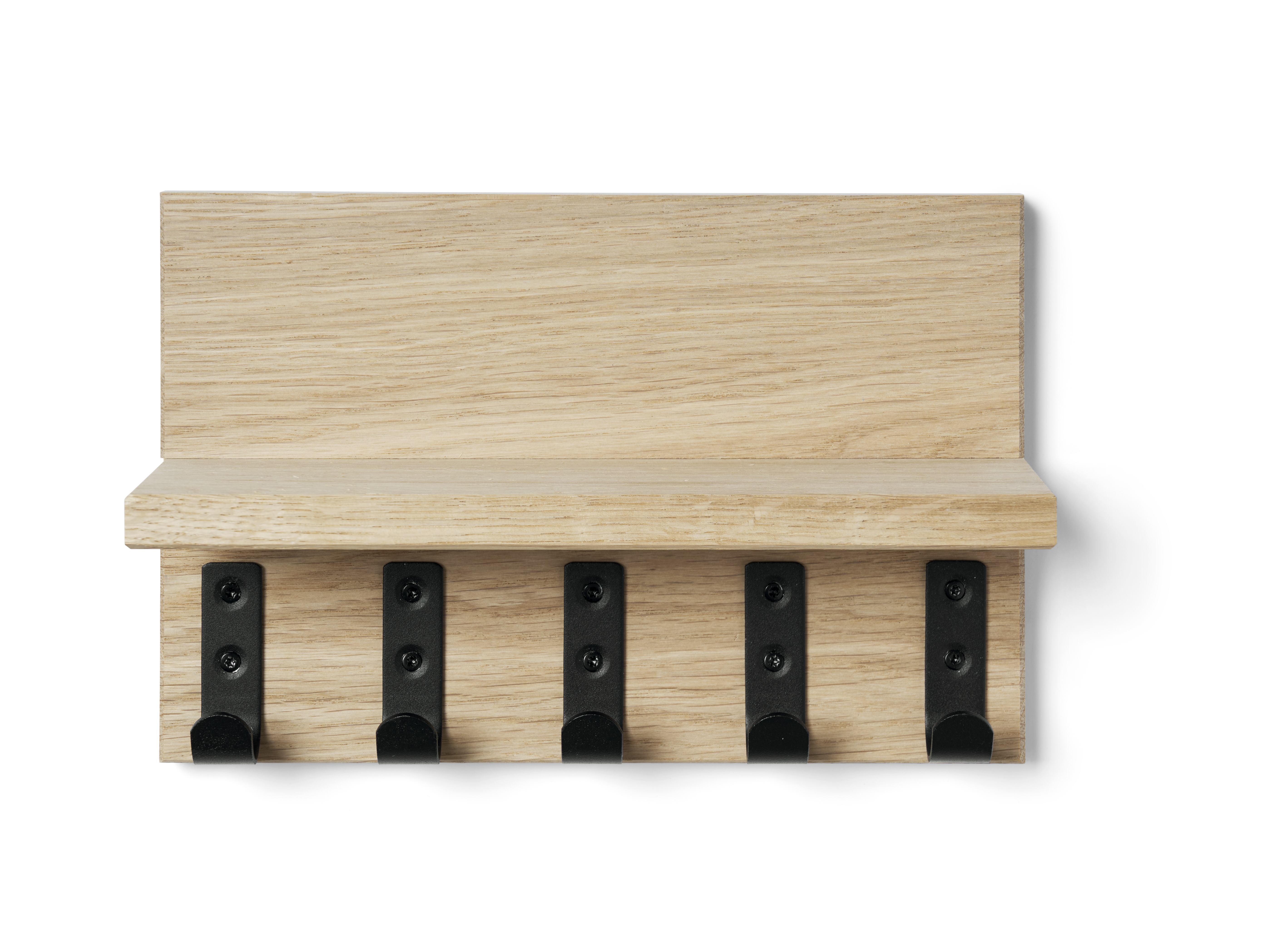 Praktisk nøgleholder med hylde og fem sorte kroge til opbevaring af dekorationer, pung, nøgler eller lignende.