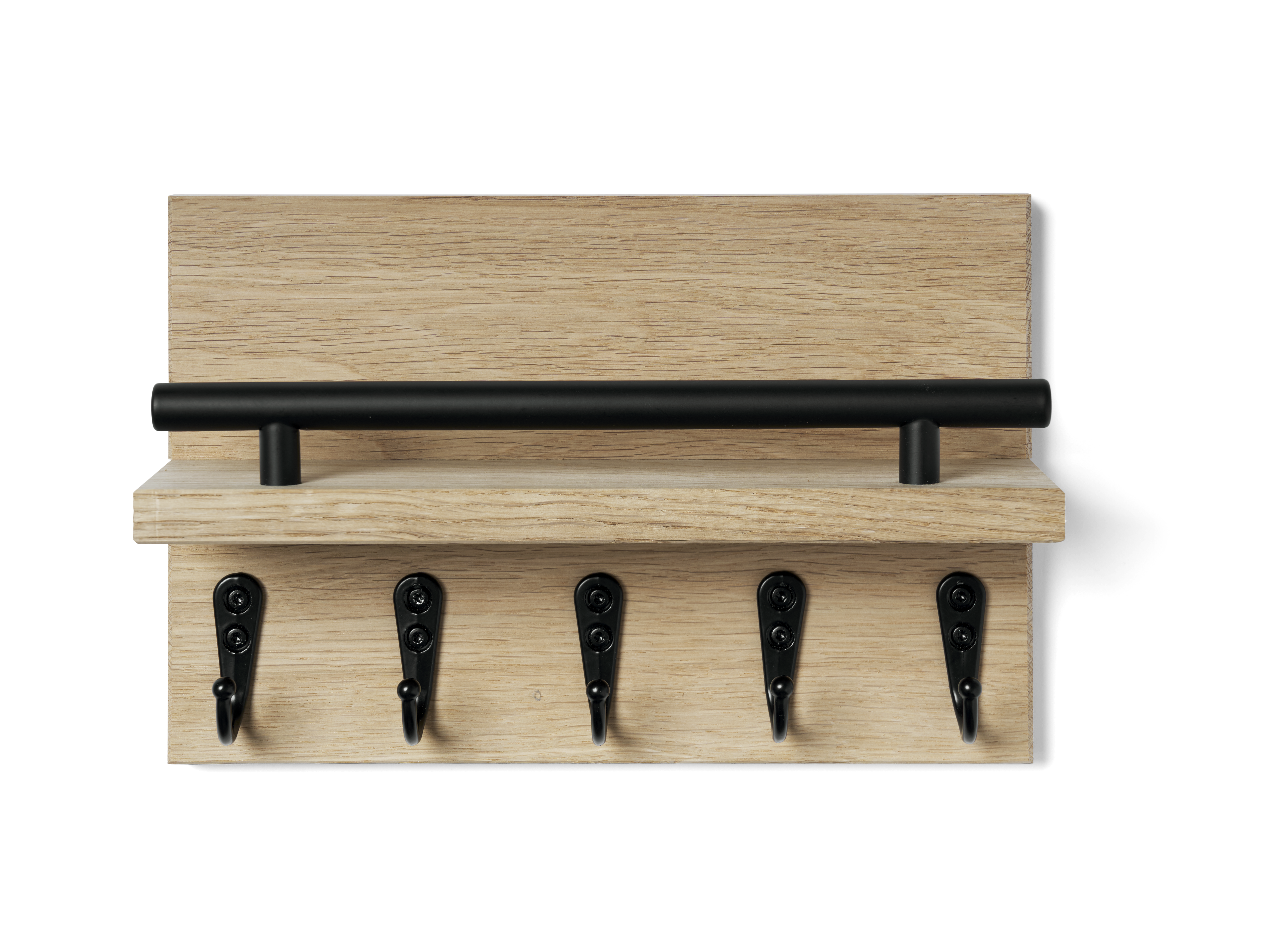 Praktisk nøgleholder med hylde, sort rælingsgreb og fem sorte kroge til opbevaring af pung, mobiltelefon, nøgler eller lignende.